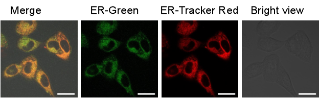 ER-Green是生光生物科技公司通過對對文獻報道內(nèi)質網(wǎng)探針進行結構修飾與優(yōu)化,篩選得到的一類高選擇性內(nèi)質網(wǎng)定位綠色熒光探針。ER-Green可以用于活細胞內(nèi)質網(wǎng)特異性熒光染色。與商業(yè)化 ER-Tracker Red 等探針相比,ER-Green熒光強度強,細胞毒性低,光穩(wěn)定性強。ER-Green在活細胞內(nèi)持續(xù)時間長,可以和其它探針實現(xiàn)聯(lián)合使用。
